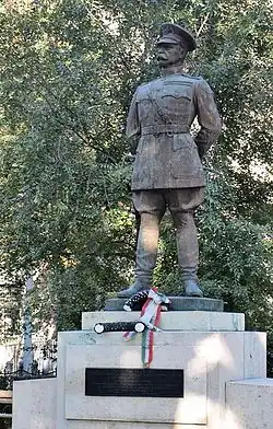 The statue was unveiled in 1936, created by renowned Hungarian sculptor Miklós Ligeti. It portrays Bandholtz holding a riding crop behind his back, a compromise reached due to Romanian objections to the statue.[21] The riding crop signifies an incident on October 5, 1919, where Bandholtz stopped Romanian soldiers from entering the Hungarian National Museum and taking artifacts and treasures from within it.[22][23] According to the Romanian military authorities occupying Hungary, they wanted the returning of the Transylvanian heritage assets from the museum that retreating Austro-Hungarian troops had previously taken from the region at the end of World War I, some of which were willingly returned as Bandholtz himself confirmed.[23]