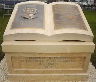 A statue commemorating Carl Lutz was unveiled on December 13, 2006, in a park adjacent to the U.S. Embassy at 12 Liberty Square.[17][16] The ceremony was attended by Hungarian, Swiss, and American politicians, as well as representatives of the Jewish community.[17][16] The memorial acknowledges Lutz's courageous actions that saved tens of thousands of Hungarian citizens persecuted as Jews during World War II.[16]