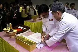 13. ^ After a legislative paper is signed by the King and countersigned by a competent authority, the seals are affixed to it by the officers of the Cabinet Secretariat which acts as their Keeper. Following that, a copy is published in the Government Gazette, whilst the original paper is placed for safekeeping at the Cabinet Secretariat. The constitution, however is made into three handwritten copies in the form of a traditional Thai book. The three copies were then given to; the Cabinet Secretariat, the Secretariat of the House of Representatives and the Bureau of the Royal Household. (Chettha Thongying, 2010: 41–47).