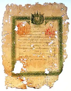 The importance of the seals were attested when another law provided a punishment for the forgery and altering of sealed documents.[9] Simon de la Loubère remarked that the king's own authority was linked to that of his seal. In times of turmoil and dynastic conflict, exceptional importance was attached to the seals, as it was considered that the kingdom's power and authority laid with their custodian. These seals did not survive the sacking and destruction of the city by a Burmese army in 1767.[10]