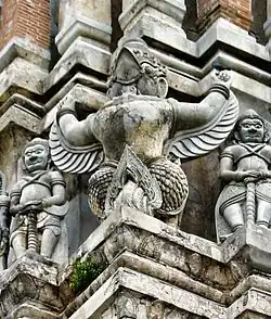 The Garuda is a birdlike mythological beast of the Hindu and Buddhist tradition. According to mythology, the Garuda is a large hybrid half-man and half-bird creature. The Garuda is often depicted in art as having the head, beak, wings and talons of an eagle, while his torso is like that of a human man.[1] In the book Traiphum Phra Ruang, a Thai Buddhist literary work composed in the 14th century, he is described as having a body that was 150 yojanas across (1 yojana equivalent to 1.6 kilometres), his left and right wings 150 yojanas each, his tail 60 yojanas long, his neck 30 yojanas, his beak 90 yojanas and his talons 12 yojanas each.[2][3]