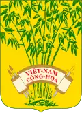 Escutcheon of South Vietnam.[31] | 1957 – 1 November 1963 | Bushes of bamboo vert and a scroll argent with the inscription "VIỆT-NAM CỘNG-HÒA", encompassing an ink brush (representing civil mandarins) and a sword (representing military mandarins); both of which are proper.[30] A coloured version of this coat of arms shows the background or, the bamboo vert and the bordure gules.[17] Influences: |