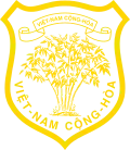 Emblem of South Vietnam.[29] | 1957 – 1 November 1963 | Bushes of bamboo and a scroll with the inscription "VIỆT-NAM", encompassing an ink brush (representing civil mandarins) and a sword (representing military mandarins).[30] A coloured version of this coat of arms shows the background yellow, the bamboo green and the bordure red.[17] |