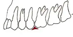 In dentistry, embrasures are V-shaped valleys between adjacent teeth. They provide a spill way for food to escape during chewing[1] which essentially aids in the self-cleansing process. They also prevent food from being forced through the contact area which might cause food packing and periodontal pain and permit a slight amount of stimulation to the gingiva.