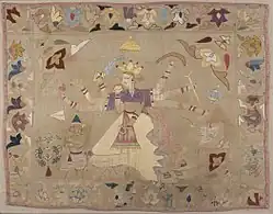 It originated in Chamba kingdom of Himachal Pradesh in 17th century. This embroidery flourished in the princely hill states of Kangra,[7] Chamba, Basholi, and other neighbouring provinces. The Chamba region has highly skilled craftsmen. Chamba embroidery has its own distinctive style, small squares or rectangles of clothe embroidered with untwisted silk threads.[8] While untwisted silk is most common some Chamba embroidery make use of thin metal wires or metallic yarn.[9] While the chamba rumal originated in the 17th century it reached widespread popularity in the 18th century after rulers in the Himalayan region patronized Chamba Rumal embroiderers.[10] The original Chamba embroideries were done by women or young children, the embroideries often depicted gods or goddesses.[8] Original Chamba embroideries were very important in marriages as the embroideries were kept as the brides dowry.[8] Chamba embroideries often began by drawing an outline on the rectangular square of fabric, while originally embroidered by women at the height of popularity in the 18th century many male painters drew the outlines and embroidered the clothe themselves to ensure high quality work.[8] Not long after its height of popularity in the 18th century the chamba rumal's popularity declined. The rumals began to lose their sacredness, today most rumals are made by families trying to sell them to survive, and the Chamba Rumals are not of the same quality as they were in the 17th and 18th century.[8] While this art style has declined over the years and almost been lost, in 2009 Lalita Vakil was given the Shilp Guru award for her ability and skill in Chamba embroidery.[11]