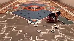 Soares used oriental references as inspiration, combined with prominent saints from India, the Middle East and Portugal to create contemporary appropriations in the series of recontextualizing saints. Her practice explored patterns of carpets in combination with sand from the dunes of Qatar, and natural dyes from India,[4] to create ephemeral Sand Carpets. The changing patterns of the carpets due to guests walking on the piece reflects her multinational identity.[5]