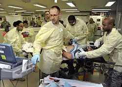 Emergency physicians in the United States typically work in emergency departments. Patients come in for a variety of reasons, including severe, life-threatening complaints such as strokes and heart attacks, potentially life-threatening complaints like severe abdominal pain, and less severe complaints such as mild injuries. The emergency physician is expected to oversee their care, rule out life-threatening diseases, stabilize the patient if necessary, and decide if the patient needs to be admitted to the hospital for further care or discharged home to follow up as an outpatient.[5] Emergency physicians work with a large number of other professionals, including physician assistants/nurse practitioners, registered nurses, pharmacists, respiratory therapists, medical technicians, medical scribes, and more. For more information on what the practice of an emergency physician looks like, see emergency medicine.
