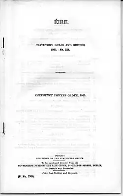 - Department of the Taoiseach (5 September 1939). Emergency Powers Order 1939 (PDF). Vol. P.3764. Dublin: Stationery Office. Retrieved 12 December 2016.