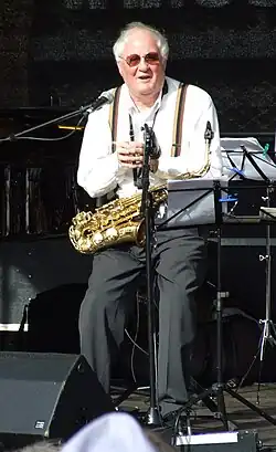 Mangelsdorff was influenced by swing.[5] He continued to develop musically, playing bebop, fusion and cool.[11][12] In 1964, Mangelsdorff wrote an instruction manual for jazz saxophone.[13] He played with Charles Mingus in New York[5] and performed often in the Jazzkeller (jazz cellar) in Kleine Bockenheimer Straße, Frankfurt, sometimes together with his brother, trombonist Albert Mangelsdorff.[8][14] He gave his last concert in Frankfurt's Holzhausenschlösschen on 1 November 2021.[5] He also informed in schools about the Nazi era as a witness of the time, continuing remembrance work until old age.[4]