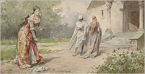Emilia first appears on stage in 2.1 when she arrives in Cyprus with Iago, Desdemona, and Roderigo. Iago resolves that Emilia should "move for Cassio to her mistress" at the end of 2.3.[1]