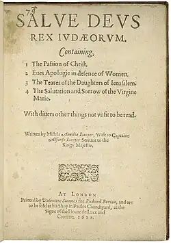 Lanier's book is the first book of substantial, original poetry written by an Englishwoman. She wrote it in the hope of attracting a patron. It was also the first potentially feminist work published in England, as all the dedications are to women and the title poem "Salve Deus Rex Judaeorum", about the crucifixion of Christ, is written from a woman's point of view.[2] Her poems advocate and praise female virtue and Christian piety, but reflect a desire for an idealised, classless world.[12]