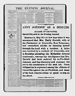 In all versions of the initial disclosure, the "idle gossips" of Greeneville (a town of about 3,000 people) both believe and spread "half a dozen or more" versions of the Harold–Johnson affair, and generally assign responsibility to Johnson. Harold is typically described as a victim of "seduction" and/or "atrocious calumny."[18] The most pointed and public version, published in an Indianapolis newspaper 10 days after Harold's death, was entitled "Andy Johnson as Seducer" and claimed that "Great indignation is expressed among the citizens of Greeneville at the ex-President, and many of the best citizens refuse to speak to him on the street."[28] By the end of May the story was widespread enough that, in a letter to Johnson, one Thomas W. Dick Bullock offered his sympathy in regard to the "base and malicious slander perpetrated by some designing persons".[29]