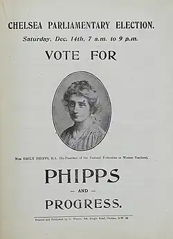 The 1918 general election was the first in which women could both vote in parliamentary elections and stand as candidates, and Emily Phipps was one of the 17 enfranchised women who took the opportunity to stand,[2] becoming Independent Progressive candidate[14] for Chelsea constituency with the backing of the NUWT. All the women candidates were heavily defeated, but she retained her deposit in a straight contest (with a low turnout) with the sitting Conservative MP, Sir Samuel Hoare.[15] Whilst campaigning for election, she set up a model polling booth where women could practise voting.[16] She also arranged for babysitters to look after women's babies so that they could vote, which the Sunday Mirror described as her organising 'a band of women helpers who looked after children whilst their mothers voted'.[17]