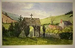 - Deserted Village, signed 'E.M.B.',watercolour, dated May 1883, with handwritten poem on back 4.5 × 7.5 in