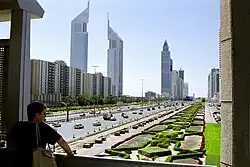 The Emirates Office Tower, is a 54-floor office building along Sheikh Zayed Road in the city of Dubai, United Arab Emirates. Connected with the 56-floor Jumeirah Emirates Towers Hotel by a retail boulevard, the two towers form what is commonly referred to as the Emirates Towers complex. The tower has a total structural height of 355 m (1,165 ft) and roof height of 311 m (1,020 ft), making it the 55th-tallest building in the world.[4] The Emirates Office Tower One is taller than the neighbouring Jumeirah Emirates Towers Hotel, but has two fewer floors. Construction of the building was completed on 3 November 1999.