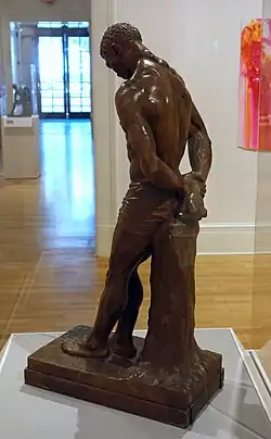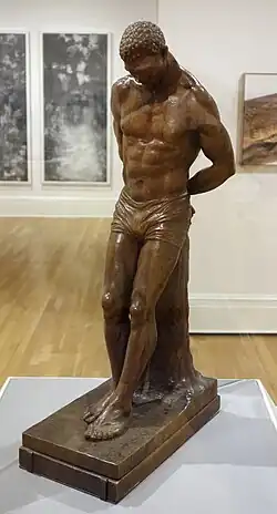 One of Cadwalader-Guild's earliest works was a statue of an emancipated slave, created in 1876 and entitled Free.[3][10] According to a frequently repeated story, which first appeared in a profile of the artist in 1904, the inspiration for the work came from her encounter with a dejected African-American man at the Boston market. After spending weeks creating a clay model of the man, she arranged for it to be cast in bronze in Italy.[6][10] Although the original bronze has been lost, the composition of the sculpture is known from a copy in wood carved by German sculptor Otto Braun.[10][11] In Braun's copy, the half-nude man leans against a tree trunk with his head down; his hands, held behind his back, are unbound, but from the front his posture suggests that he is still in chains. The ambivalence of the figure has been interpreted as a reflection of the lasting psychological effects of slavery and the ambiguous position of emancipated slaves in the Reconstruction era.[10][11]
