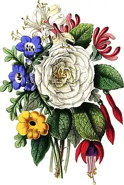 In 1851, Peachey self-published the manual The Royal Guide to Wax Flower Modelling, which instructs on how to model in wax to create accurate depictions of a range of flowers.[2][7][11] Queen Victoria permitted the book to be dedicated to the Princess Royal.[12] Aimed at women, it promotes the craft as a feminine art particularly suitable for young women, emphasising its health benefits compared with competing pastimes such as embroidery.[2] Peachey supplies basic instructions for blending colours and using tools such as curling pins. She suggests observing flowers in botanic gardens such as Kew and Regent's Park.[7] Although not intended as a botanical text, and less focused on science than the 1852 work by Rebekah Skill, The Royal Guide explains some botanical information.[2] It equally draws on the language of flowers to instruct readers on the meanings of flowers, and also includes short poems.[2][7] Its four colour lithographs depict arrangements themed by season,[7][11] with the flowers being juxtaposed purely for aesthetic effect.[11]