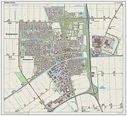 At the heart of the Noordoostpolder, where the three main drainage canals Lemstervaart, Urkervaart and Zwolsevaart[2] intersect, is the city of Emmeloord (1943). Named after an abandoned village on the island of Schokland, Emmeloord is located in a polder: land reclaimed from the IJsselmeer, which earlier was part of the sea. Planned from the outset to be the first and the only major town of the polder, it is the local government and services centre.