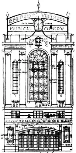 The theatre was designed by Kaberry and Chard,[1][2] and built by R. P. Blundell as a music hall for a syndicate led by leading bookmaker Rafe Naylor.[3] The site was a 150 by 130 feet (46 m × 40 m) block on the Bijou Lane corner of Quay Street ("Saunders' Corner"[a]), Railway Square, near the side entrance to Central Station. It opened on 1 May 1927 with the new Jerome Kern musical Sunny, followed by The Student Prince.[4]