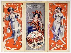 The Empress Theatre was built for Messrs W. H. Burney and W. J. Grimes and was designed by Wylson & Long and built by the contractor T. L. Green. The Empress could seat 1,260 on three levels, stalls and pit, Dress Circle and Gallery, and had a large stage 60 foot wide by 40 deep with a proscenium opening 30 foot wide. The electric lighting and heating was installed by Messrs Strode and Co.. The box-office hall was decorated with marble mosaic by Messrs Diespeker and Co., and was fitted with Japanese leather decorations. The auditorium, decorated in the French Renaissance style, was fitted with 'chaste embellishments' of nine panels 'each ornamented by a heraldic dive of griffins.. clawing a shield in delicate pink'[3] measured 75 foot by 64 foot in the clear over which was a "lofty saucer-shaped dome". Over the proscenium, on each top corner, were positioned reclining female figures of Euterpe and Terpsichore, while over the two boxes, placed on each side of the proscenium on the dress circle level, were paintings, again in the French Renaissance style. The Empress opened on Boxing Day 1898 with a variety show. The Music and Theatre Review of 30 December 1898 recorded that on the theatre's opening night hundreds of patrons were turned away. On the 'bill' that night were Brixton's Kate Carney as well as a display of the Thomas Edison moving pictures.[4] The singer and comedian Arthur Lloyd appeared here in 1900, 1901 and 1902.[1] Other performers to appear at the Empress at this time included Joe Elvin, Vera Lynn, Tommy Fields,[5][6] Wilson, Keppel and Betty,[2] Marie Lloyd and Harry Lauder.
