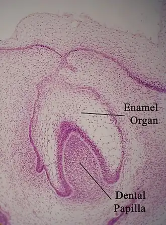 The enamel organ, also known as the dental organ, is a cellular aggregation seen in a developing tooth and it lies above the dental papilla.[1] The enamel organ which is differentiated from the primitive oral epithelium lining the stomodeum. The enamel organ is responsible for the formation of enamel, initiation of dentine formation, establishment of the shape of a tooth's crown, and establishment of the dentoenamel junction.[1]