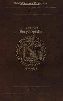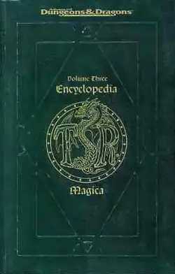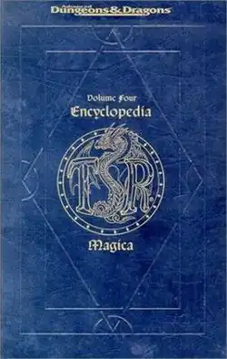 Encyclopedia Magica is a four-volume set intended to present every magic item ever published for Dungeons & Dragons up to that point, from Abacus of Calculation to Zwieback of Zymurgy.[1] The books in this series list every magical item published in all boxed sets and game supplements and every magazine article published for the AD&D game system from the previous 20 years.[2] The books total more than 1500 pages over the four volumes, and each is bound in a plastic jacket resembling leather.[1] Entries for the series were reproduced from sources including the Dungeon Master's Guide, the Dungeons & Dragons Basic Set and Dungeons & Dragons Expert Set, adventure modules and campaign settings, magazines such as Dragon.[1]