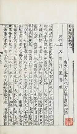 The Yiwen Leiju, or translated as Encyclopedia of Literary Collections,[1] is a Chinese leishu encyclopedia completed by Ouyang Xun in 624 under the Tang dynasty. Other contributors include Linghu Defen and Chen Shuda.