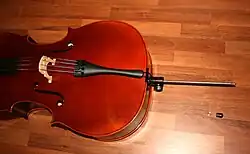 An endpin, more commonly spelled end pin and also called tailpin,[1] is the component of a cello or double bass that makes contact with the floor to support the instrument's weight. It is made of metal, carbon fiber, or, occasionally, wood, and is typically extensible from the bottom of the instrument, secured there with a thumbscrew or other tightening mechanism. Most bass clarinets and contrabassoons also have a similar fixture. Endpins became a standard part of the cello in the mid-19th century. Before then, celli were held tightly with the legs. Some performers of pieces of baroque music continue to not use an endpin during period performances.[2] The endpin is widely credited to making the cello more appealing to play for women, who were before compelled to hold the instrument on the floor due to the complicated dress and fashion of the time.[2]