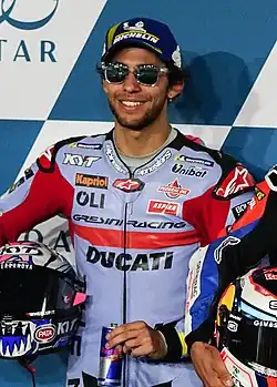 Bastianini won the first race of the 2022 MotoGP season, the 2022 Qatar Grand Prix and became the championship leader.[5] Gresini Racing and Bastianini made history by winning with a 2021-specification Ducati Desmosedici GP21.[6] After mid-pack results in Indonesia and Argentina, where he took P11 and P10 respectively, he took his second win at the Circuit of the Americas in Austin. This was followed by a DNF in Portugal and P8 in Jerez. At the French Grand Prix in Le Mans, Bastianini took another win, after overtaking both factory Ducatis to return to the top step of the podium. This win meant he was just eight points adrift of championship leader Fabio Quartararo after seven rounds. He returned again to the podium with a 2nd-place finish in at the San Marino Grand Prix. Bastianini then took his fourth win of the season at the Aragón Grand Prix, then another 2nd-place finish at the Malaysian Grand Prix.