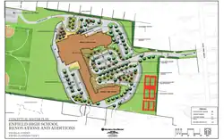 Plans for the consolidated building at Enfield High School by the firm, Silver Petrucelli & Associates, and construction company, Gilbane, called for a four floor "STEAM" (Science, Technology, Engineering, Art, Mathematics) wing addition to the south end of the building off A-wing which will include state-of-the-art science labs and classrooms. A-wing will see a "like-new" renovation, as well the rest of the facility, that would gut the entire building to its core structure and will construct updated classrooms. A grand lobby with a tiered glass enclosure is proposed for the main entrance. B-wing plans to house an expanded guidance department and career services office. Expansion to the gymnasium out of the north end of the building will result in renovated locker rooms and health classrooms; and cardio, wellness, and weight rooms. Expansion to the cafeteria and auditorium will double their size. Renovations to C-wing also include a second lobby for the performing arts music wing with expanded music classrooms, practice rooms, and offices. The entire building will be implemented with advanced technology and air-conditioning. Site-plans reworked campus landscaping, traffic flow, and parking spaces for faculty and students. The total cost of construction for the expansion and renovation to Enfield High School is approximately $103 million.[13][14] However, with a reimbursement rate from the State of Connecticut at approximately 73% the town will pay a share of approximately $35 million, bonded over 20 years. The closing of Enrico Fermi High School as a school will result in approximately $2 million in savings each year. Plans state that savings from the closing of one high school will pay for the 20 year bond, according to the Enfield Pre-Referendum High School Consolidation Committee. If the referendum did not pass, Enfield's two high schools would have remained open, but would have required limited renovations for updates to each facility at a cost of $50 million each, which would not be reimbursable by the state, in order to adhere to the State of Connecticut's new educational mandates that go into effect in 2017. Moreover, issues with Americans with Disabilities Act regulations had to be addressed in both buildings. The referendum went to town's voters in November 2012, and passed by a 2:1 margin.[15]