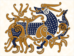 This secluded runestone is located in a grove near Väsby, Uppland, Sweden. It was raised by a Viking in commemoration of his receiving one danegeld in England. It is classified as being carved in runestone style Pr3 and, together with U 344, it has been said to be the earliest example of an Urnes style inscription in Uppland.[5] The runic text follows a common rule to only carve a single rune for two consecutive letters, even when the letters were at the end of one word and the beginning of a second word.[6] When the text shown as Latin characters, the transliterated runes are doubled and separate words are shown. For U 194 has three examples where this occurred, þinoftiʀ is transliterated as þino| |oftiʀ, tuknuts as tuk| |knuts, and anklanti as a| |anklanti.