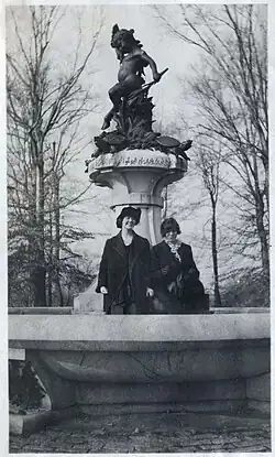 Enid Yandell's sculpture the "Struggle of life" was commissioned by Italian diplomat Paul Bajnotti, of Turin, Italy, in memory of his wife Carrie Brown. Dedicated in 1899, the Carrie Brown Memorial (also referred to as the Bajnotti Fountain) is located in Burnside Park in downtown Providence, Rhode Island. She exhibited a plaster version of the fountain - then named "Struggle of Existence" - for the 1901 Pan-American Exposition in Buffalo, New York.[7] The group of five figures was described in a contemporary journal article as "the struggle of the Spirit of Life to escape from the hampering influence of Duty, Avarice, and Passion."[9] Yandell described the sculpture as representing "the attempt of the immortal soul within us to free itself from the handicaps and entanglements of its earthly environments."[10]