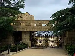 The main entrance is through a pair of gates for pedestrians and vehicles, which are decorated with Mayan motifs. The vehicular gate leads to the house's motor court,[20] which is surrounded by a low wall.[44] The motor court, in turn, connects to a detached carport or semi-open garage with space for two vehicles.[45] A doorway leads from the motor court directly to the main house's loggia; the original plans called for an open-air loggia, but it was enclosed to give the house a direct entrance from the motor court.[46] An outdoor swimming pool, dating from 1940,[47][48] is located on a terrace abutting the house's northern facade.[20][49] The pool is variously cited as measuring 20 by 40 feet (6.1 by 12.2 m)[50] or 18 by 44 feet (5.5 by 13.4 m) across.[45] The terrace abuts a bedroom and library inside.[51] Both the main house and the garage wing have large windows and elaborate columns.[52]