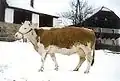 The small light Ennstaler Bergscheck was long believed to have originated from the Bavarian Weißkopfscheck ("White-headed Pied Cattle") but recent archaeological discoveries indicate descent from the local cattle of the La Tène period (5th–1st centuries BC).[1] Once they were almost totally foxy red before the white spots in their fur increased, until 75%–80% of the fur was white with only the loin and the side remaining clouded or with fringed spots. The inner ears are coloured. Horns, hooves and mucosas are mostly pigment free.[2]