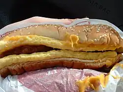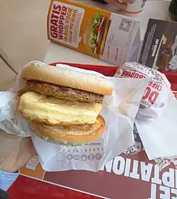 The Supreme Breakfast Sandwich (formerly the Enormous Omelet Sandwich) is a breakfast sandwich sold by the fast-food restaurant chain Burger King. It consists of sausage patties, bacon, eggs and American cheese on a sesame seed bun. The Meat'normous Omelet Sandwich was a variant on the Enormous Omelet Sandwich that added a portion of ham to the sandwich.