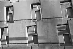 Miralles, like many other postmodern architects, has a preference for piling on the motifs and ideas: upturned boats, keel shapes, deep window reveals like a castle, crow-steps, prow shapes, diagonal gutters, 'bamboo bundles' and above all the dark granite gun-shape that repeats as an ornamental motif at a huge scale. Everywhere broken silhouettes compete for attention, just like the alleyways next door. That's fine, and contextual, but it's quite a meal. As a result of the complexity, the parliament is really a kind of small city, with much too much to digest in one short three-hour sitting. The Scottish parliament will take time to judge: maybe not 50 years but three or four visits, long enough to absorb all the richness and get used to those jumpy black granite guns, the most arbitrary of several questionable ornaments.[4]