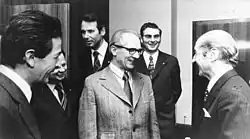 During his leadership, Berlinguer distanced the party from the influence of the Communist Party of the Soviet Union and pursued a moderate line, repositioning the party within Italian politics and advocating accommodation and national unity.[5][6] This strategy came to be termed Eurocommunism, and he was seen as its main spokesperson.[7] It came to be adopted by Western Europe's other significant like-minded parties, such as the Communist Party of Spain and later the French Communist Party; its significance as a political force was cemented by a 1977 meeting in Madrid between Berlinguer, Georges Marchais, and Santiago Carrillo.[8] Berlinguer described his alternative model of socialism, distinct from both the Soviet bloc and the capitalism practised by the Western bloc during the Cold War, as terza via.[9][10][11] His usage of the term has no relation to the Third Way practised by subsequent prime ministers Romano Prodi and Matteo Renzi, but actually refers to a "third way" to Socialism after the emergence of the Social democratic parties of the late nineteenth century and the communist revolutions in Russia or China.