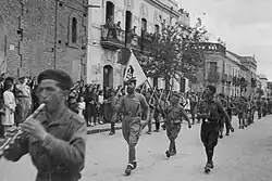 In August–October Barrau was involved in numerous requeté operations in western Andalusia.[70] It appears that he commanded one of 3 companies of a battalion, headed by professional officers; first Luis Redondo and then José María García Paredes.[71] Initially the unit operated west of Seville in the Huelva province, suffocating pockets of republican resistance in Sierra de Aracena and the mining region of Rio Tinto;[72] then it was shuttled towards the Málaga province and as part of so-called "Columna Redondo" took part in fightings for Saucejo.[73] Already when the unit was renamed to Tercio Virgen de los Reyes, Barrau was engaged in operations on the Cordobese front in the Peñarroya-Pueblonuevo sector; in October requetés seized the Anarchist stronghold of Bujalance and set their headquarters there.[74]