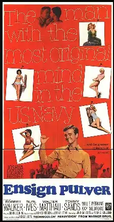 Ensign Pulver is a 1964 American Technicolor comedy drama film in Panavision and a sequel to the 1955 film Mister Roberts. The film stars Robert Walker Jr., Burl Ives, Walter Matthau and Tommy Sands and features Millie Perkins, Larry Hagman, Kay Medford, Peter Marshall, Jack Nicholson, Richard Gautier, George Lindsey, James Farentino and James Coco.[3]