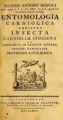 Entomologia Carniolica exhibens insecta Carnioliae indigena et distributa in ordines, genera, species, varietates is a taxonomic work by Giovanni Antonio Scopoli, published in Vienna in 1763. As well as describing hundreds of new species, Entomologia Carniolica contained observations on the species' biology, including the first published account of queen bees mating outside the hive.[1]