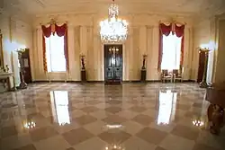 During the John F. Kennedy administration, the Entrance Hall (like most of the White House) underwent an extensive historic redecoration. The redecoration of the State Floor rooms, including the Entrance Hall, was overseen by American antiques autodidact Henry Francis du Pont and French interior designer Stéphane Boudin. Du Pont wanted a more historic approach to the White House, while Boudin preferred a French design aesthetic.[13] Du Pont originally redecorated the Entrance Hall with two French pier tables, a settee, a card table, and two tables by Charles-Honoré Lannuier. Boudin had all but the pier tables removed, and his style is the one which remained over the next several decades.[14]