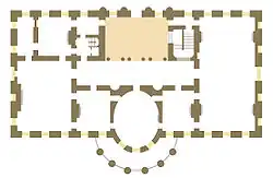 In 1853 Thomas U. Walter installed a cast iron and clear glass screen between the Entrance Hall and Cross Hall to reduce drafts, and a complexly patterned Minton encaustic tile floor.[3] In 1869 Constantino Brumidi, the fresco painter who had recently painted The Apotheosis of Washington in the ceiling of the new rotunda and Senate wing of the Capitol,[4] applied highly ornamental painted decoration to the walls and ceilings including profile portraits of George Washington and Abraham Lincoln. On the ceiling Brumidi painted allegorical figures of Union and Liberty. They have survived and are displayed in the ground floor of the White House in the Palm Room.[5]
