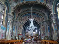 In the interior, the wide altar arch is supported by pilastered columns. The choir column capitals are in late Romanesque or early Gothic style, decorated with plants. The nave is covered by four domed double-arched sections, resting on four pairs of pilasters.[1] The church is listed as a historic monument by Romania's Ministry of Culture and Religious Affairs.[2]