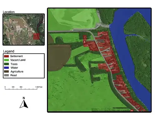 Environmental geology includes both the monitorization and planning of land use. Land use maps are made to represent current land use along with possible future uses. Land maps like the one shown can be used to reduce human settlement in areas with potential natural hazards such as floods, geological instability, wildfires, etc.[13] In the land map shown it can be seen that there is a margin of trees and vegetation between the settlements and Mississippi River to reduce the risk of flood damage as the Mississippi Rivers water levels change.