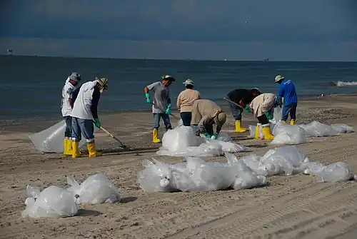 In August 2010, scientists had determined as up to 79% of the spilled oil remained in the Gulf of Mexico, under the surface.[61] In March 2011, it was reported that thousands of pounds of oil and dispersant were collected each day from highly visible resort areas and that 17,000 lb (7,700 kg) were collected from a beach in Alabama after a winter storm.[62]