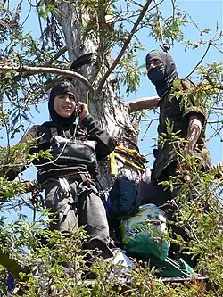 Demonstrators in a tree at the Berkeley oak grove protest in 2008