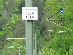 The line to Bad Wildbad is equipped with the 15 kV AC overhead electrification system used by Deutsche Bahn. The extension of the line from Bad Wildbad station through the town of Bad Wildbad is electrified as a tramway with 750 V DC. The terminus of the line is located at the entrance to the spa.