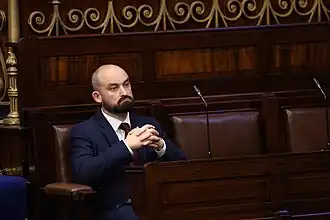 Eoin Hayes (born 15 October 1987) is an Irish Social Democrats politician, who has been a Teachta Dála (TD) for the Dublin Bay South constituency since the 2024 general election.[2] Hayes served as a member of Dublin City Council from June 2024 until his election to the Dáil.[3] He was indefinitely suspended from the Social Democrats parliamentary party almost immediately after the election following a controversy over holding shares in Palantir Technologies. He sat as an independent politican during the first session of the 34th Dáil, but was readmitted to the Social Democrats in July 2025.[1]