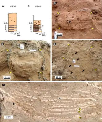 Large cylindrical sediment-filled structures, 115 of which interpreted as mammal burrows occur within the loess-paleosol sequence of the formation.[11]