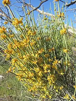 Ephedraceae is agreed to be the most basal group amongst extant gnetophytes. Members of the family typically grow as shrubs and have small, linear leaves that possess parallel veins. The fossil Ephedraceae genera show a range of morphologies transitional between the ancestral lax male and female reproductive structures and the highly compact reproductive structures typical of modern Ephedra.[3][4] Modern members of Ephedra have either dry winged membranous bracts (modified leaves which surround the seed), which are dispersed by wind, leathery covered seeds, which are dispersed by seed-eating rodents, or fleshy bracts which are consumed and then dispersed by birds. Some extinct members of Ephedra from the Early Cretaceous, such as Ephedra carnosa, as well as Arlenea from the Early Cretaceous of Brazil have fleshy bracts surrounding the seeds, suggesting that these seeds were dispersed by animals.[5]